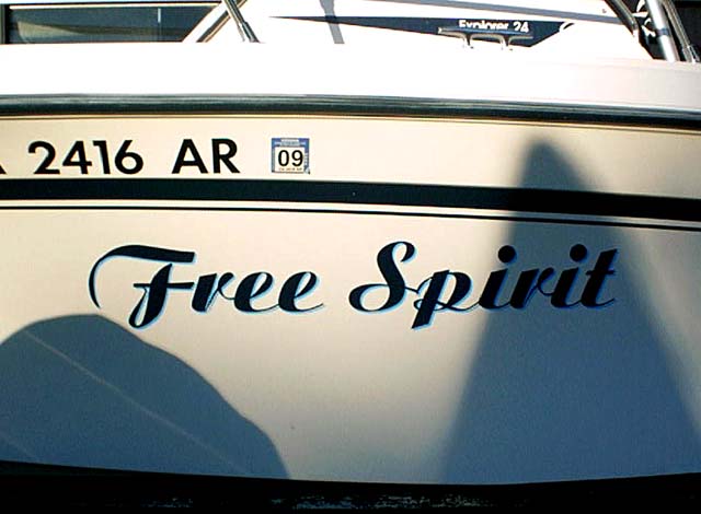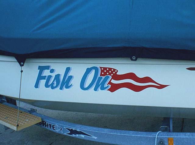 Boat name on both sides of boat, forward portion of hull. Letters cut