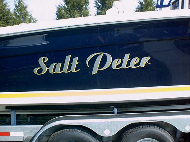 Boat name on both sides cut in metallic silver with yellow shadow to