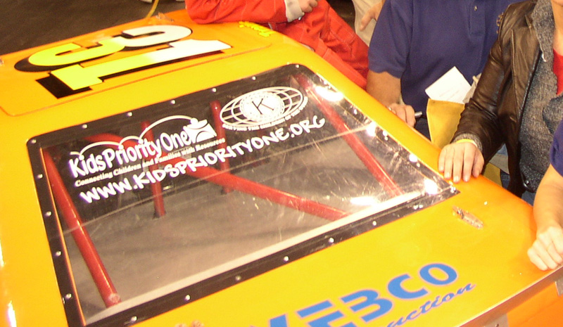 Sponsorship sticker on back window of race car.
